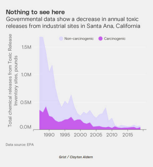 “TRI data don’t begin to do justice to — or they don’t begin to render a historically accurate picture of — industrial activity and the contamination (and legacy contamination) that inevitably sticks around when those industries leave,” Frickel said, noting that Grist’s findings in Santa Ana underscore the shortcomings of government data for revealing contamination.