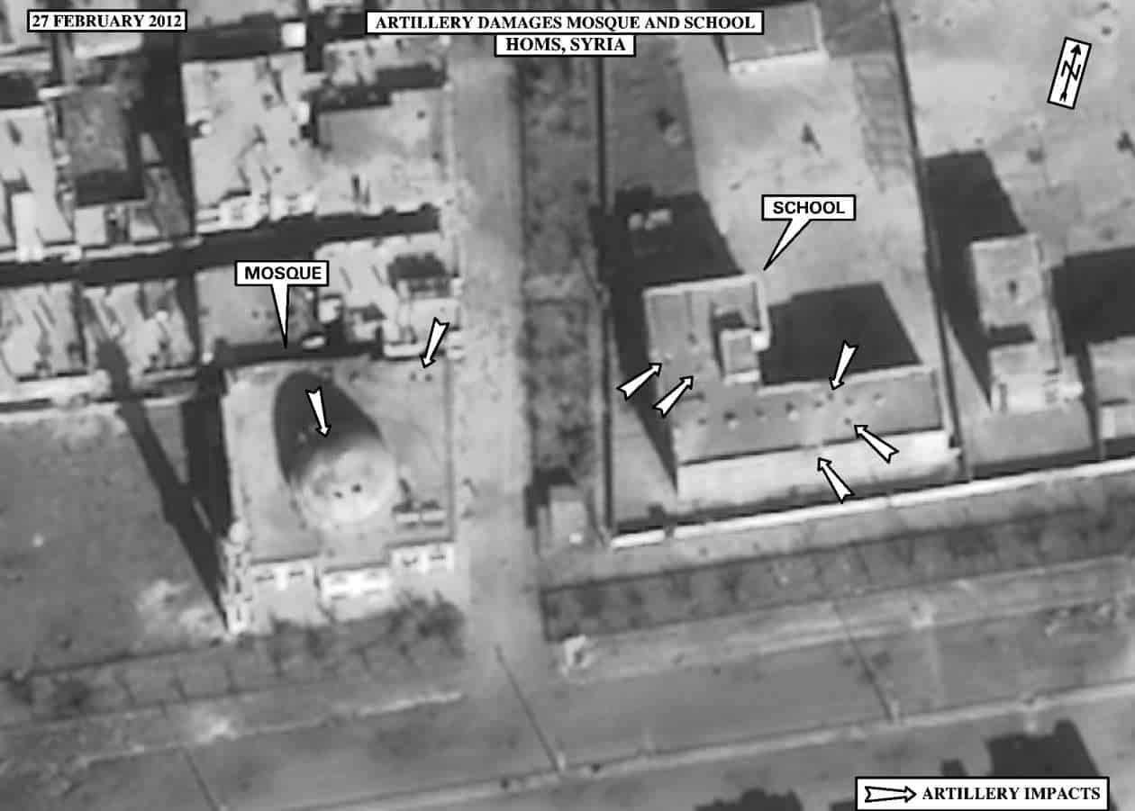 The photos do not depict atrocities, but they convincingly show the massing of Syrian armor and some of the damage caused by the shelling that government forces have made a hallmark of their military campaign against the rebellion. Several display damage to a mosque, school, medical clinic and other buildings in Homs; others display crater concentrations in the rebellious city of Homs and town called Zabadani.