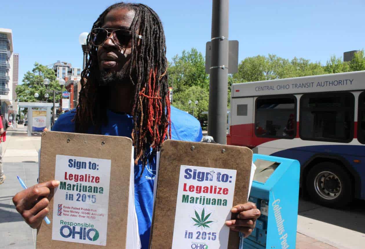 One of dozens of professional signature gatherers working on Responsible Ohio's campaign, Donnie Dawson asks passersby on a Columbus sidewalk to sign his marijuana legalization petition. “Give us the right to go vote in November against that failed drug war,” he told potential signers. Liz Essley Whyte/Center for Public Integrity